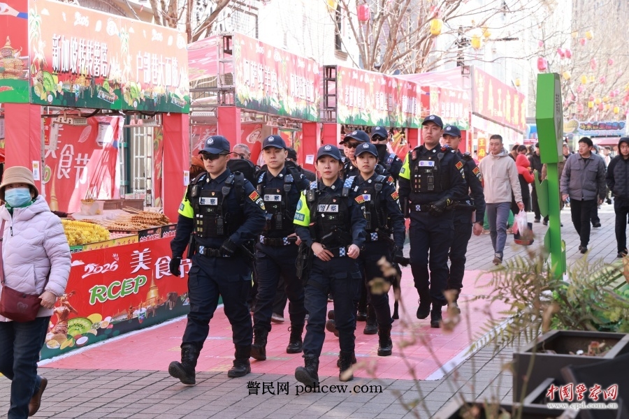 2月23日,山东省青岛市公安局市北分局青鸾特巡队民警辅警在萝卜・元宵・糖球会大鲍岛会场内巡逻防控,及时处置各类突发情况,守护市民游客人身与财物安全。张佳琪 摄