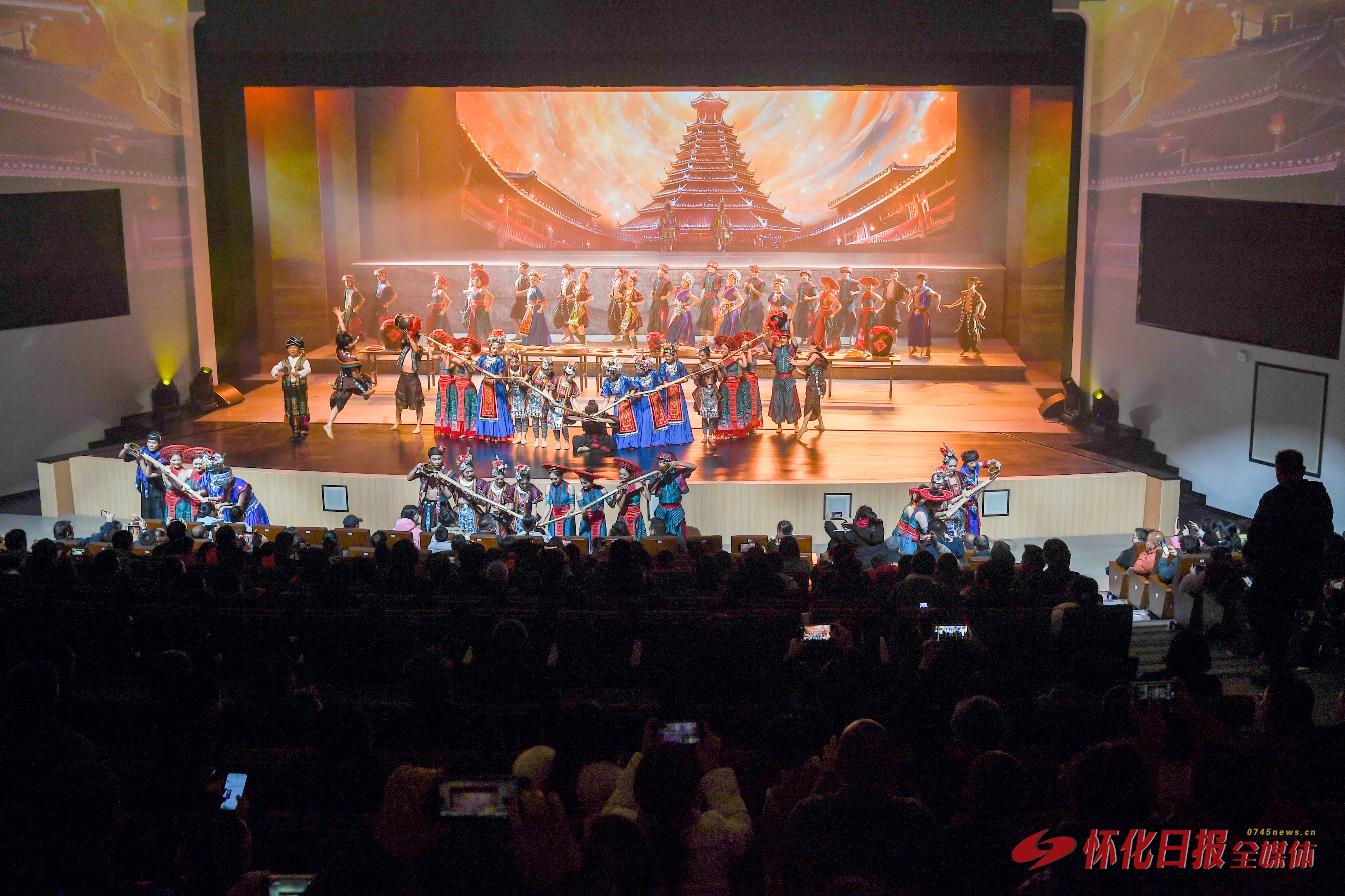 舞台上,帷幕内外影影绰绰,四季色调忽明忽暗。侗族大歌、花瑶挑花、苗族歌鼟、辰河高腔、沅水号子等非遗元素与“蹾屁股”“抹泥巴”等特色婚俗情节巧妙交织,让观众在“怀景怀乡怀味”中,触摸到怀化的文明肌理。