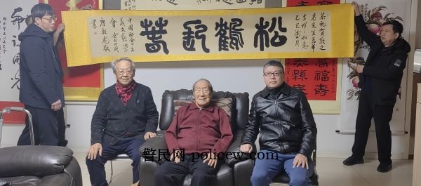 鲁太光会长首先向贺敬之部长呈送了中国社会主义文艺学会会员唐从祥(唐驳虎)写的新春祝福信,以及长约八尺、高50公分的古拙雄浑的篆书作品《松鹤长春》。