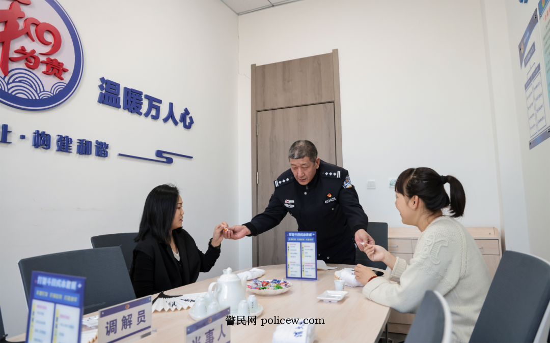 ▲抚顺雷锋派出所“朱涛调解室”内,民警朱涛开展调解工作。
