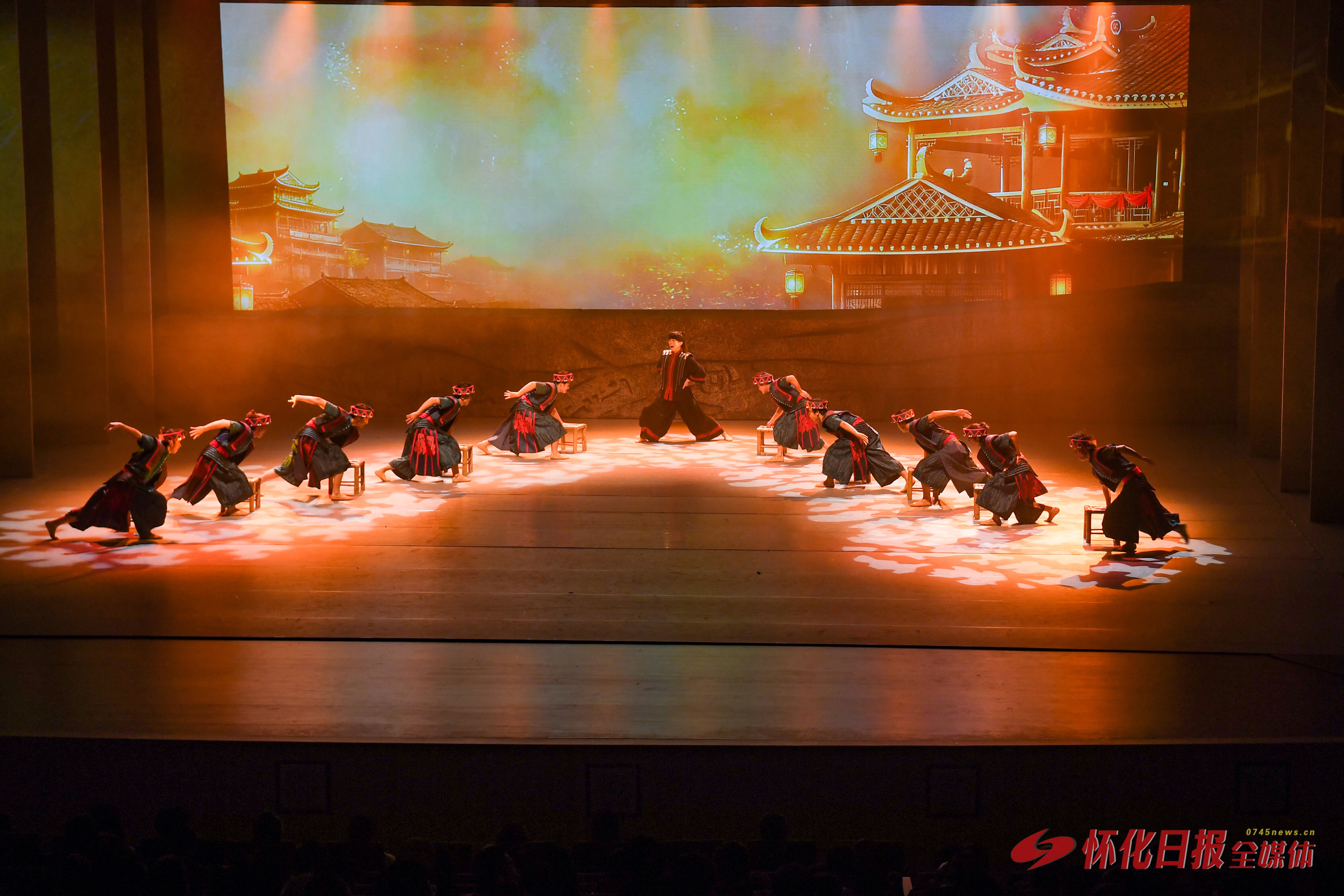 舞台上,帷幕内外影影绰绰,四季色调忽明忽暗。侗族大歌、花瑶挑花、苗族歌鼟、辰河高腔、沅水号子等非遗元素与“蹾屁股”“抹泥巴”等特色婚俗情节巧妙交织,让观众在“怀景怀乡怀味”中,触摸到怀化的文明肌理。