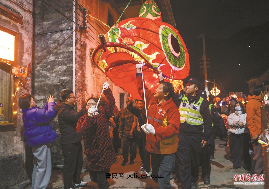 3月3日,歙县公安局民警辅警护航徽州汪满田村“嬉鱼”年俗盛宴。曹业伟 摄